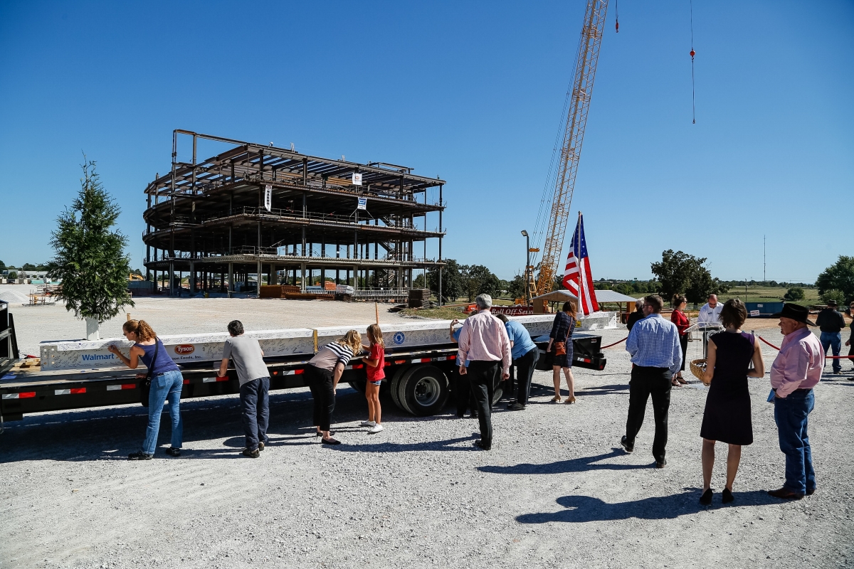 In construction, the “topping out” of a building is a builder’s rite and a long-standing tradition. The beam is the tallest beam that will be placed on the project. Last week, it was transported to corporate headquarters at Tyson Foods, Inc.; Walmart; J.B. Hunt Transport Services, Inc.; George’s, Inc. and the Arkansas Children’s Clinic at Lowell, where employees were invited to sign their names and write messages of support. Guests of the Topping Out Celebration added their signatures, as well.